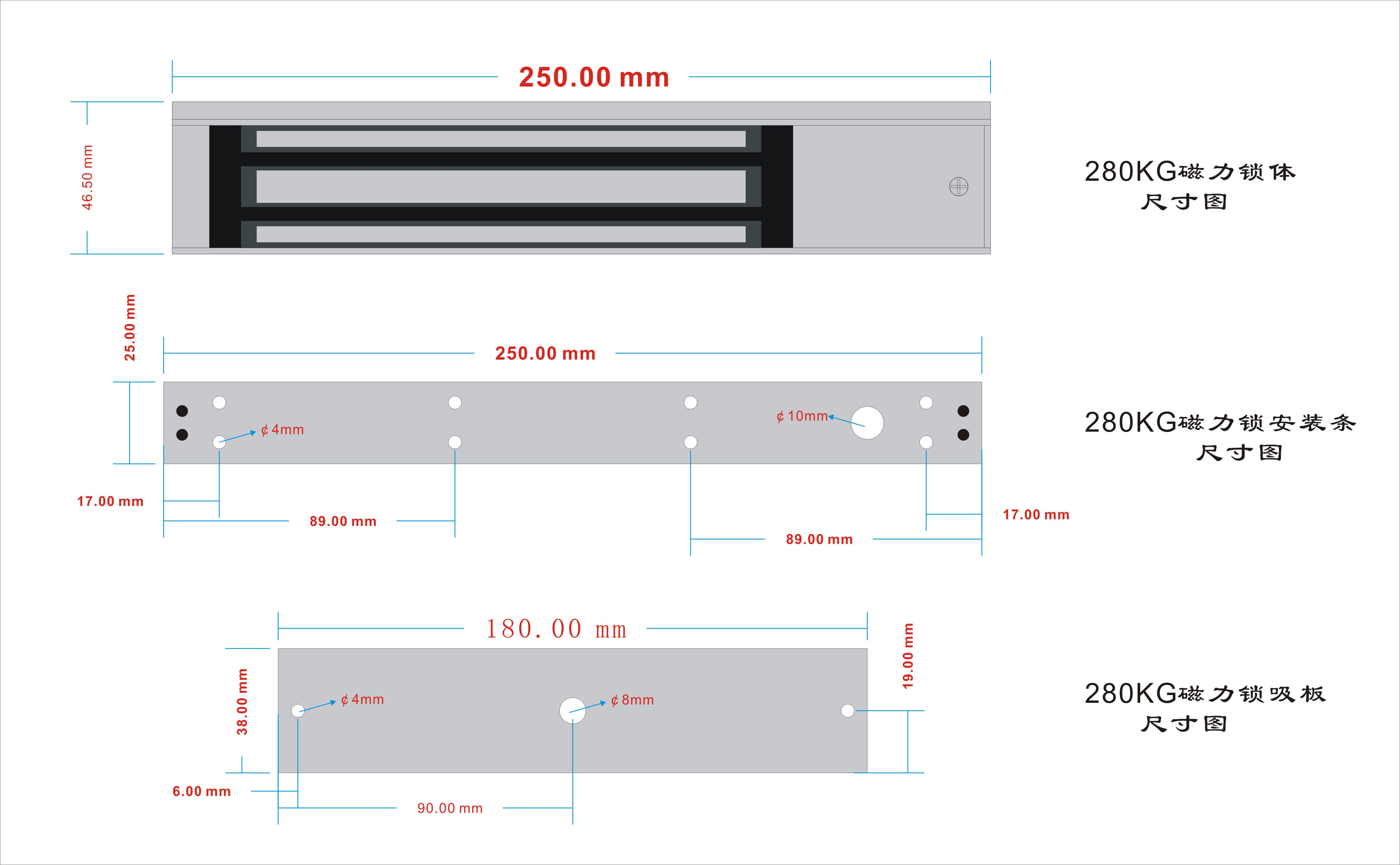 | ◆ 锁体尺寸:长250x宽48x厚26(mm) | ◆ 吸板尺寸:长180x宽38x厚11(mm) |